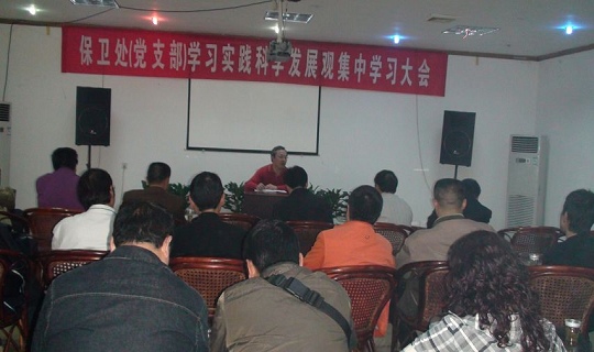 2009-04-224月18日,为了认真学习实践科学发展观,保卫处党支部在麓园举行了一次集中培训活动,邀请党委副书记李明为全体职工做科学发展观的辅导报告。支部书记周旭明处长主持报告会。