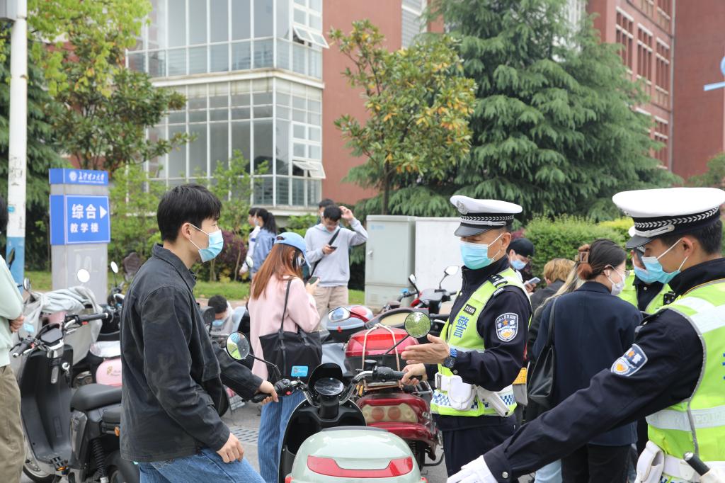 为进一步提升和规范校园交通秩序,增强师生员工交通安全意识,推进平安校园建设,4月19日,学校联合长沙市天心区交警大队,在云塘校区及周边开展交通安全专项整治行动,依照《湖南省电动自行车管理办法》重点整治驾乘电动车未戴头盔、违规加装伞具等违法现象。