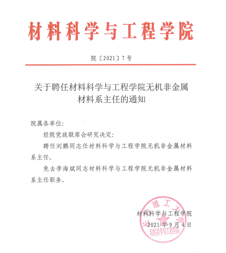关于聘任材料科学与工程学院无机非金属材料系主任的通知