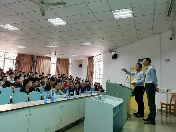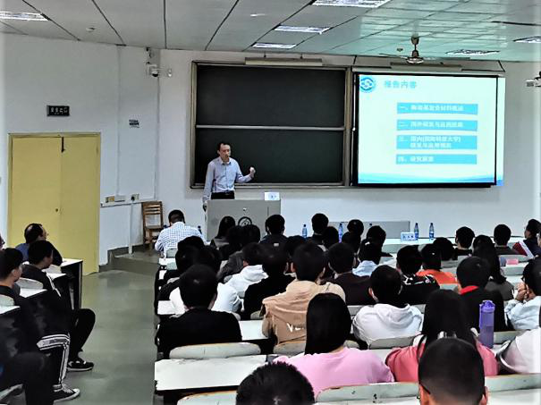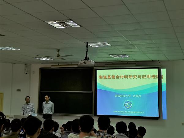 讲座开始之前,材料学院院长毛卫国教授简要介绍了马青松研究员的学习工作经历与科研成果。马青松研究员首先介绍了他从事的科学研究领域的概况,详细阐述了一些发展比较迅速的陶瓷基复合材料类别和发展历史。随后对比展示了国内外的研发与应用进展,从建设运行、研究进展、研究成果三个方面介绍了新型陶瓷纤维及其复合材料重点实验室。