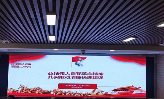 在党的二十大召开之即,为推进全面从严治党向基层一线延伸,将“清廉长理”建设融入学校发展的全过程各方面,为决胜建成“百强”大学营造风清气正的良好环境。9月27日下午,物电学院、材料学院教职工齐聚理科楼A200报告厅,聆听关于加强全面从严治党的专题宣讲。