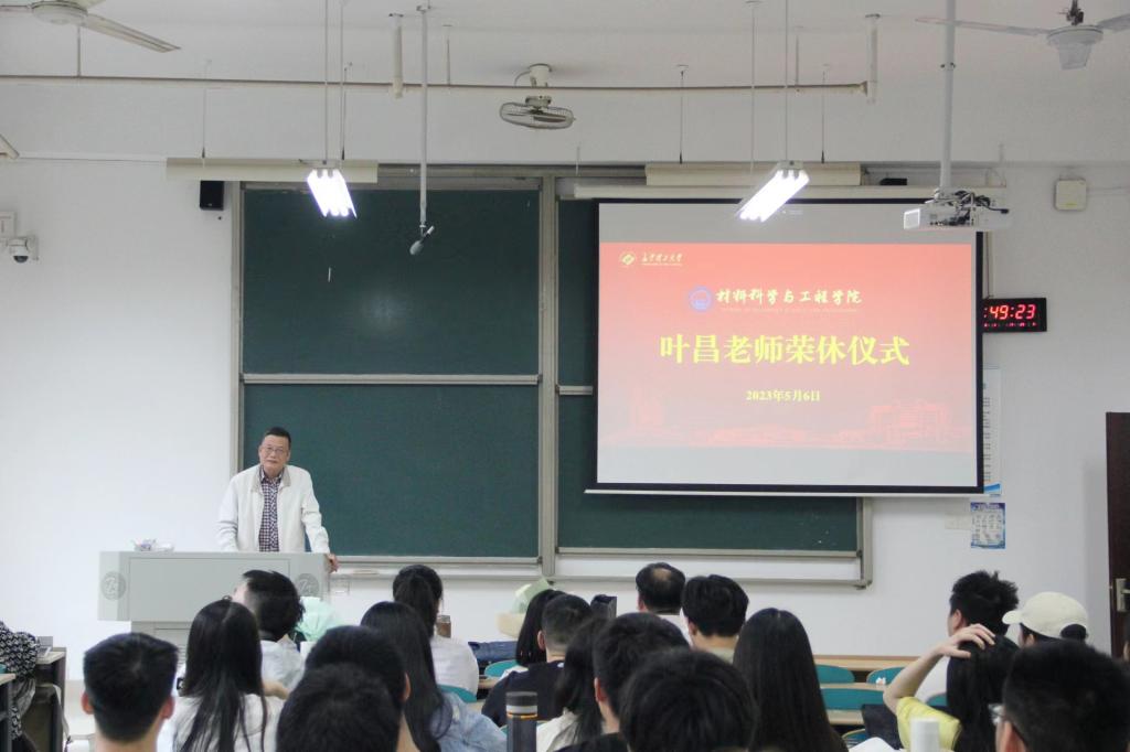 “最后一课”为叶老师的教育事业画上了圆满的句号,随后,材料学院党总支书记唐超文、院长毛卫国、副书记陈华及青年教师代表、学生代表为叶昌老师举行荣休仪式。材料学院院长毛卫国致欢送词。他对叶昌爱岗敬业、默默耕耘、不图名利、不记得失、给予了充分的肯定,代表学院表达了对叶昌的感谢,希望叶昌一如既往地关心支持学校的发展,衷心祝福叶昌拥有一个退而不休、幸福快乐的晚年生活!
