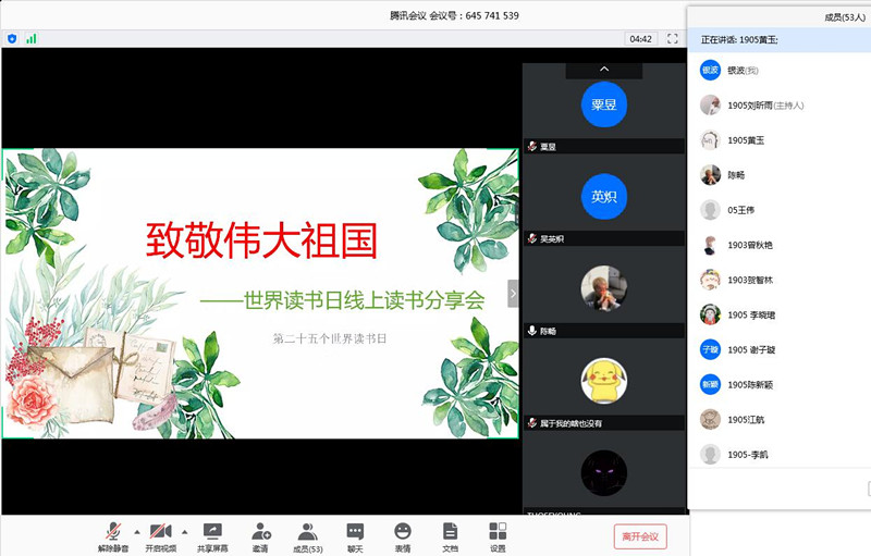 近日,材料学院以“世界读书日”为契机,依托腾讯会议应用平台举行“致敬伟大祖国——线上读书分享会”,让爱读书、好读书的同学们相约在云端,以书会友,以学增智。学院50余名学生报名参与,19级辅导员银波、1905班班主任张怡琼出席。