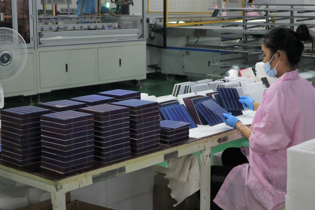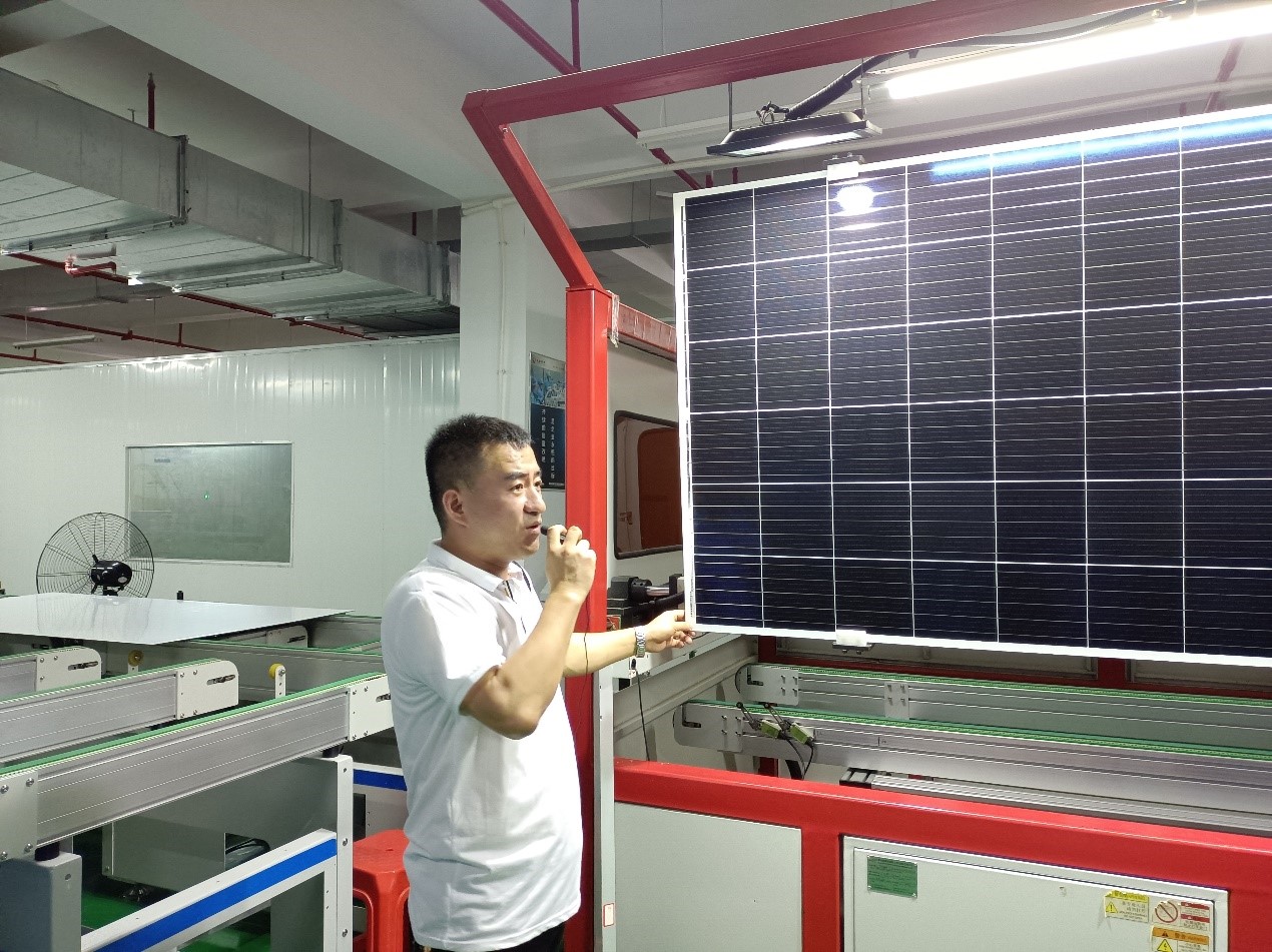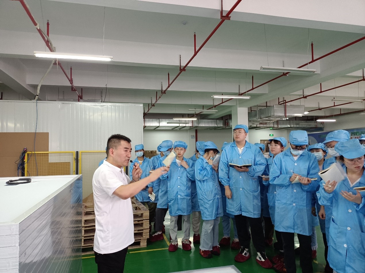 品质主管陈启明向学生们介绍了地面用太阳能电池组件封装制造的具体流程和设备工艺,讲解了“为什么太阳能电池组件需要封装?”。