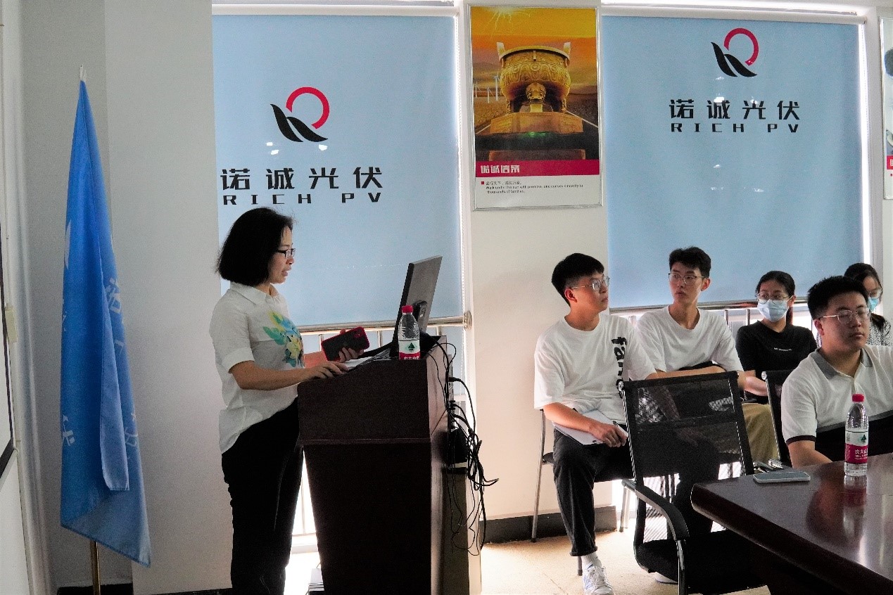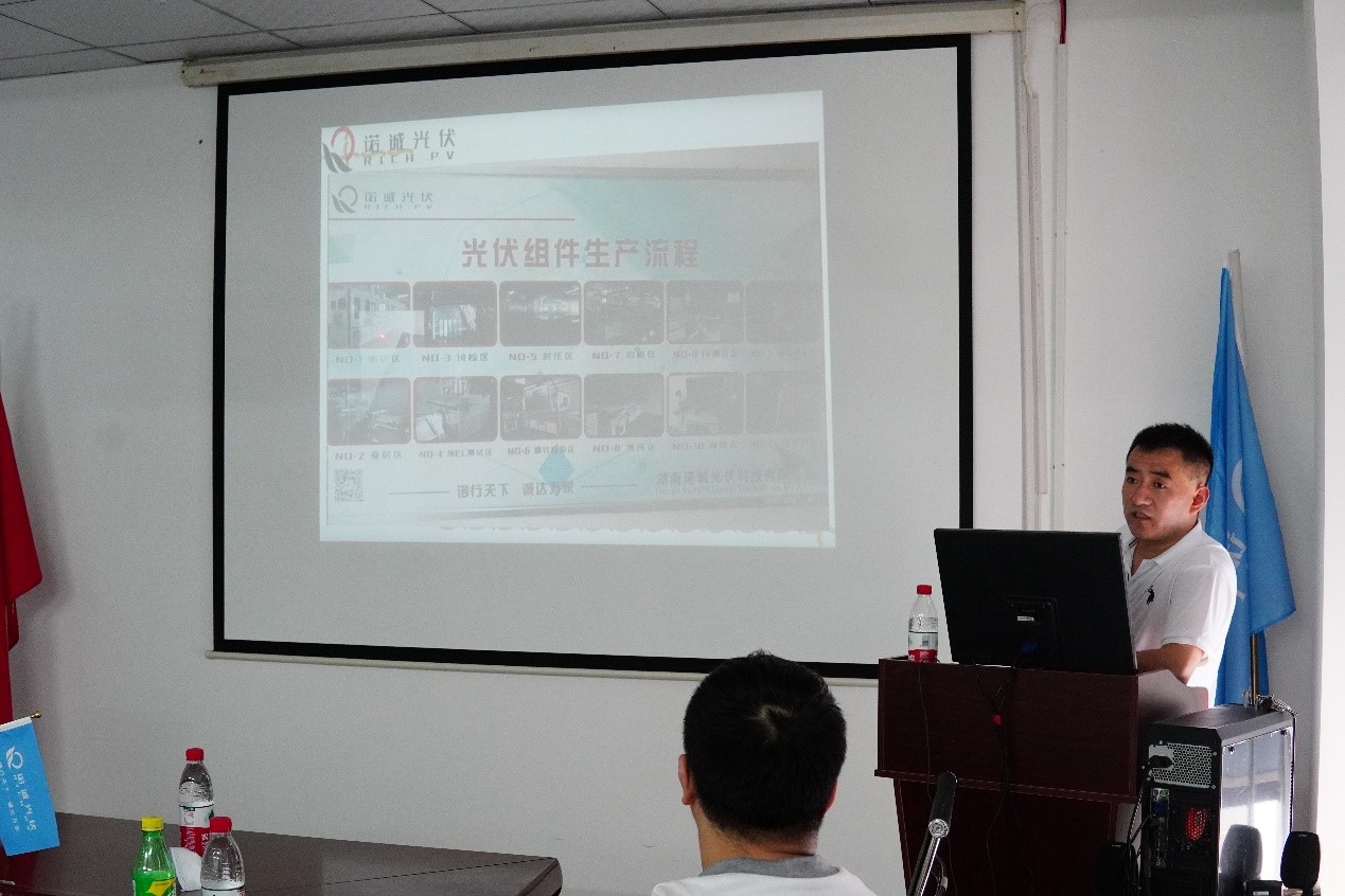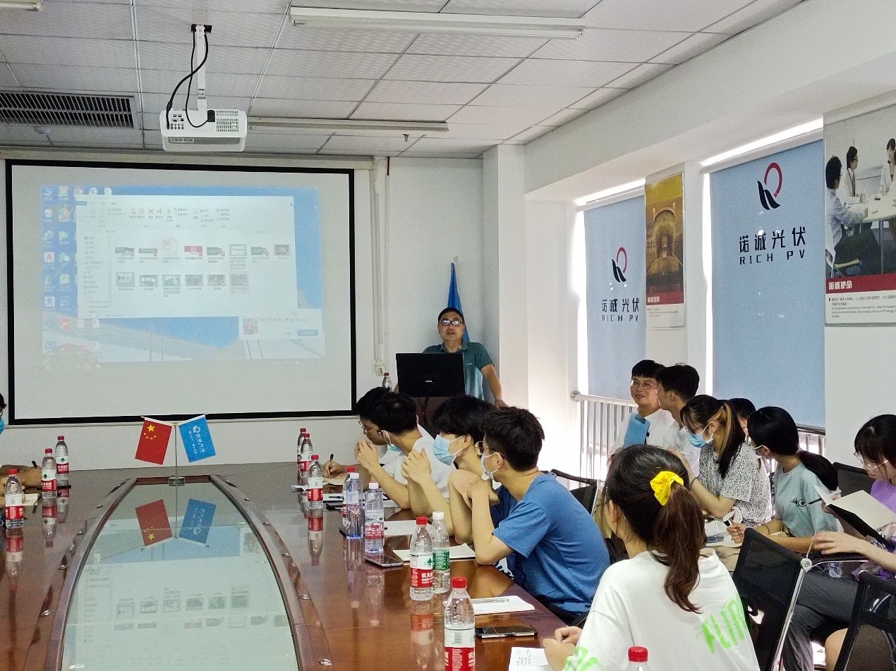 生产主管付志强随后在大会议室向学生们介绍了光伏组件生产流程、太阳能组件封装结构图、单多晶电池片原材料、太阳电池组装工艺简介,更加详细地讲解了串焊、叠层、翻转检、削边、装框、粘接接线盒、组件测试、高压测试等工艺的作用。