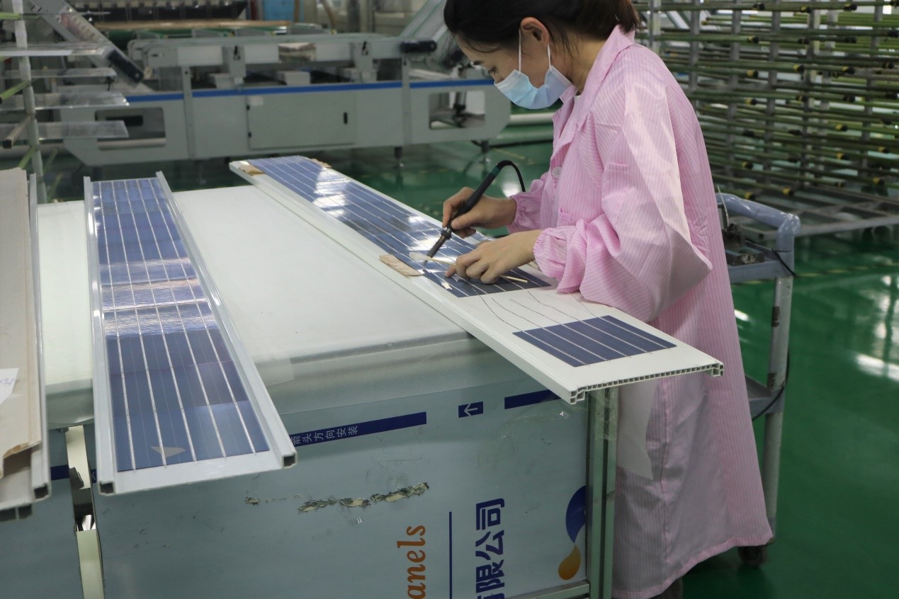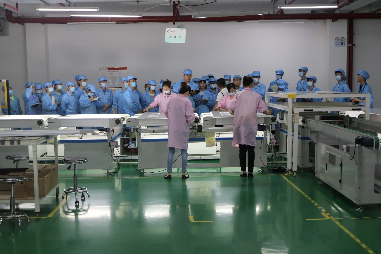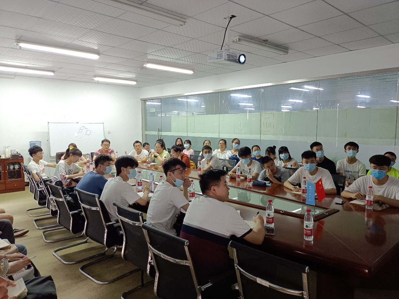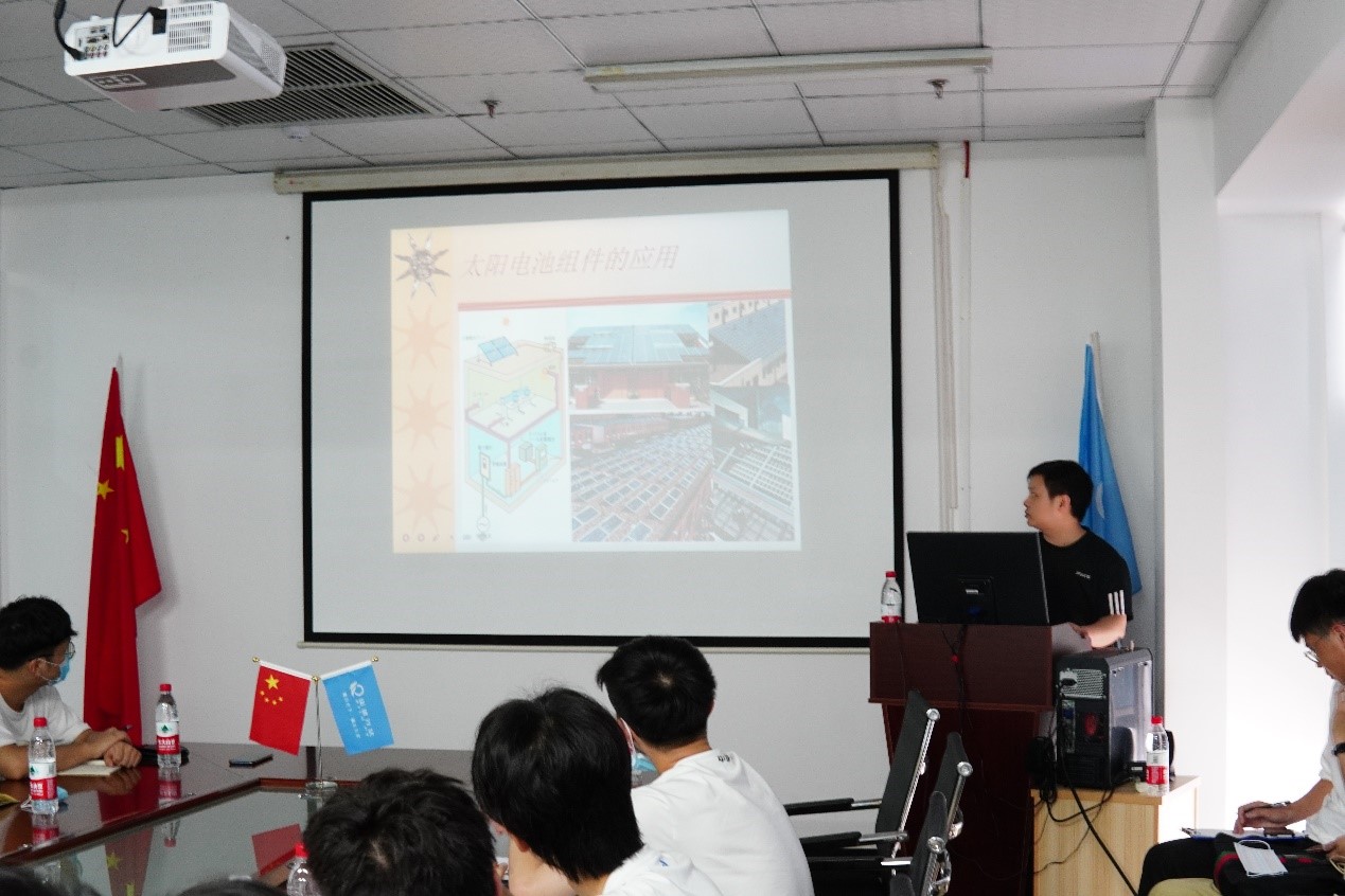 生产主管付志强随后在大会议室向学生们介绍了光伏组件生产流程、太阳能组件封装结构图、单多晶电池片原材料、太阳电池组装工艺简介,更加详细地讲解了串焊、叠层、翻转检、削边、装框、粘接接线盒、组件测试、高压测试等工艺的作用。