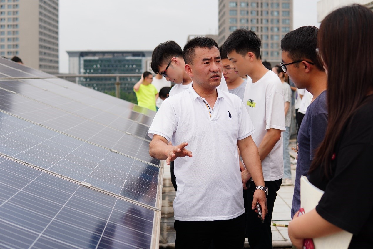 接下来,付志强带领学生们参观了湖南诺诚光伏公司的产品,如移动电源多晶高效组件、逆变器、配电器、多晶硅片、光伏路灯、光伏水泵等,并前往公司顶楼参观大型太阳能电池板,他指出公司的产品主要有两种用途,一是自发自用,二是并入电网。