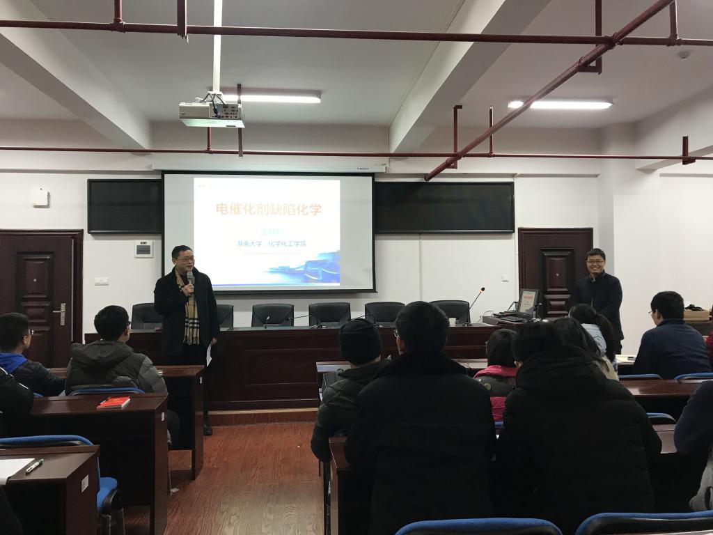 15时30分,应材料科学与工程学院邀请,国家杰出青年基金获得者,现为湖南大学化学化工学院教授,博士生导师、湖南大学化学化工学院王双印教授,在新能源大楼1A—302室多功能会议室做了 “电催化剂缺陷化学”的学术报告。报告会由材料学院党委书记张国强主持,学校科研部有关领导、材料学院、交通学院、化食学院80余名师生聆听了报告,座无虚席。