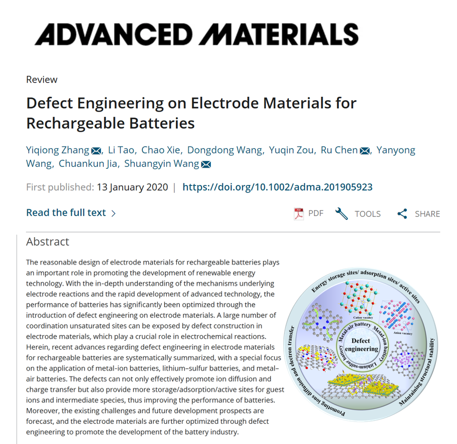 近日,伟德材料科学与工程学院张怡琼博士与湖南大学王双印教授一起合作,以第一作者与通讯作者在国际顶级期刊Advanced Materials(《先进材料》,IF=25.809)上发表题为“Defect Engineering on Electrode Materials for Rechargeable Batteries”的综述论文。