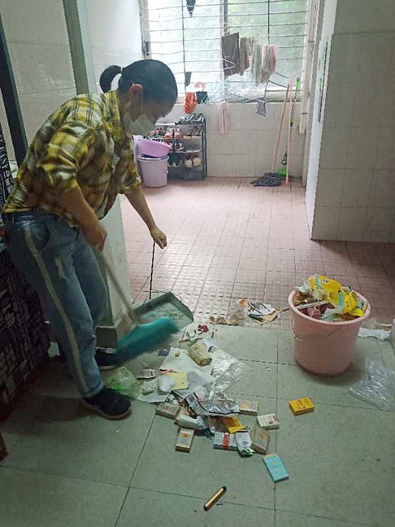 5月6日-5月11日,在学校的统一安排下,宿舍管理中心对近4000间学生宿舍展开全面洗消工作,并根据学生的远程需要和申请,帮学生晒被子;在工作中,对于个别卫生状况极差的寝室,学校还集中进行了打扫。