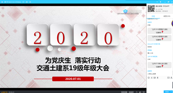 7月1日晚,交通土建系2019级学生“为党庆生、落实行动”年级大会在腾讯课堂召开,参加本次大会的有19级辅导员武建伟老师、19级辅导员助理丰崇彪老师以及相关学生。