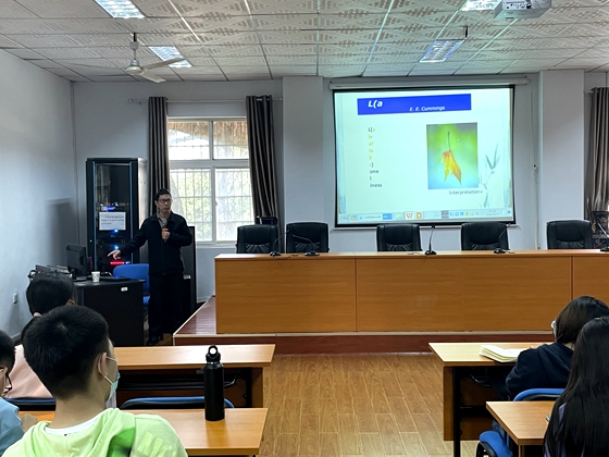刘更祥从事英美文学多年研究,他在开场时说:“每个人的骨子里都是诗人。从诗歌中可以看到语言不拘一格的一面,可以看到语言更多的可能性。”他从诗歌的介绍、途径、声音、形状、意象、修辞、形式、赏析等方面向大家详细介绍了读诗的方法与步骤。他分析了三首经典的英文诗,来告诉同学们应该如何读诗:读语言、读形式、读诗歌整体;要关注形式、语言以及形式与语言相互构建的新意义。