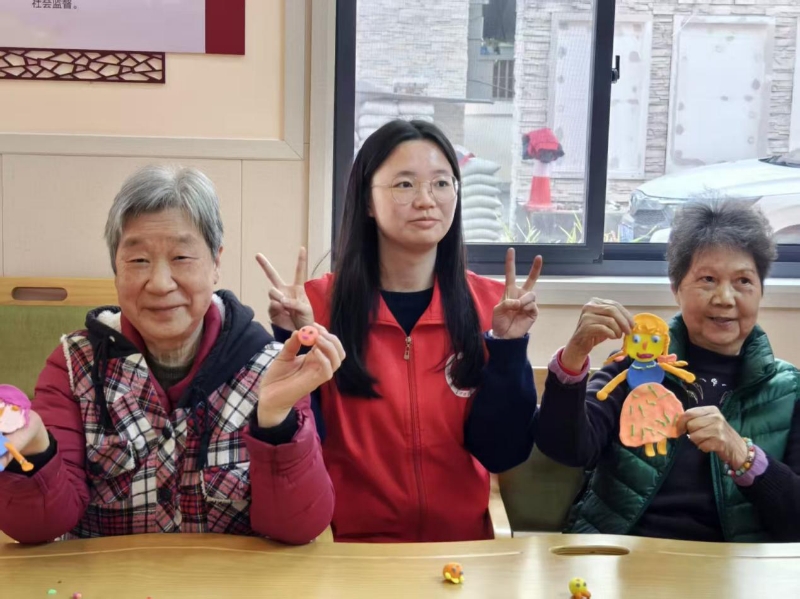 活动现场,志愿者与老人们共赴欢乐时光。在益智小游戏“彩圈串串大作战”中,老人们单手执筷,巧串彩圈,欢声笑语,其乐融融。更有老人一气呵成,串起六彩圈,寓意“六六大顺”,赢得满堂喝彩。手工黏土互动环节,志愿者们则耐心指导,老人兴致勃勃,巧手塑形,花朵绽放,创意无限。志愿者还精心为老人打造“自画像”,形象活泼可爱,备受赞誉。