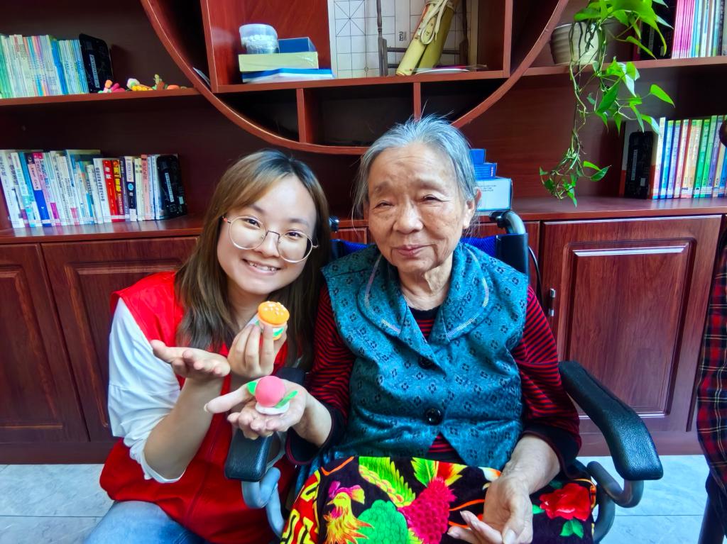 手工粘土互动环节将活动推向了高潮。恰逢母亲节,志愿者们与老人们携手,以缤纷粘土为媒,共同创作节日主题作品。老人们与志愿者两两搭档,或制作玫瑰花,或捏制康乃馨,每一件作品都饱含深情,成为跨越年龄的情感纽带。李奶奶更是精心制作了一朵红色玫瑰花,打算送给自己的女儿,传递着浓浓的母爱与温情。