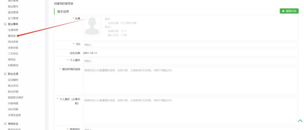 登录后,点击“就业事务”下栏“推荐表”菜单,上传个人照片及填写相关信息后,点击保存即可。