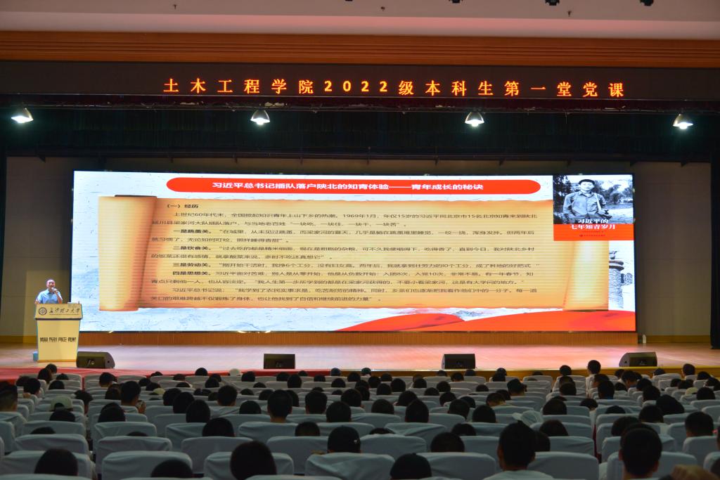 10月4日晚,土木学院在金盆岭校区五教大礼堂开展2022级本科新生第一堂党课,党课由学院党委书记江河主讲,学院党委副书记黄阿明、学工办李小军、刘文成、林安妮及全体2022级本科生新生聆听授课,党课由黄阿明主持。