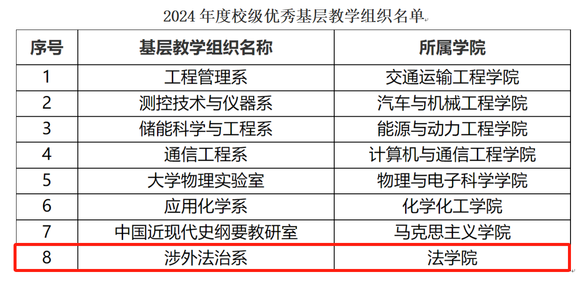 近日,经专家多轮评审伟德评选出8个校级优秀基层教学组织,我院涉外法治系荣获2024年度校级优秀基层教学组织称号。