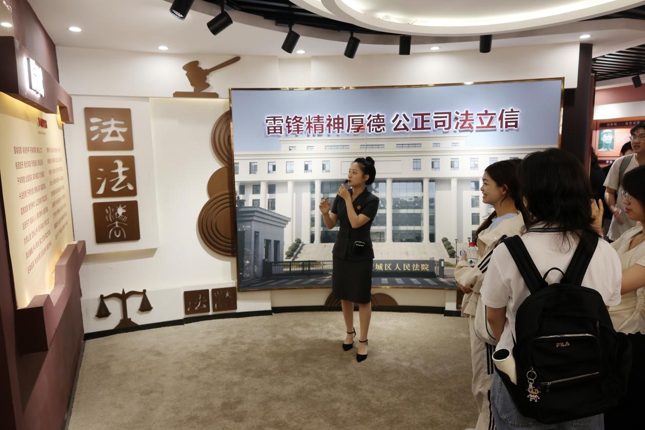 在院史馆,同学们在法官的讲解中了解到望城区人民法院的发展历程。扎根雷锋家乡,奉献人民群众,每张照片、每个案例,都体现着法院贯彻习近平法治思想与雷锋精神进行法治建设工作。走进法院的诉讼服务中心,工作人员为群众提供立案咨询、材料收转等服务,一站式解决诉讼难题,体现了司法便民理念。望城区人民法院创设的“芝麻豆子茶”方法,于温情中高效化解矛盾纠纷,给同学们留下了深刻的印象。