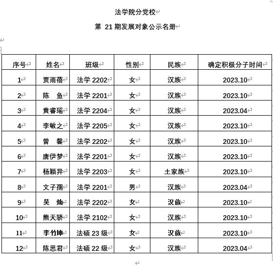 经征求党员群众和培养联系人意见后,法学院本科生党支部、法学院研究生党支部于2024年10月10日分别召开了支部委员会,经各支部讨论决定,确定贾雨蓓等12名同志为法学院分党校第21期发展对象。为发扬民主,广泛听取党内外群众意见,接受广大党员群众监督,现将贾雨蓓等12名同志的情况予以公示,公示期限为5个工作日(2024年10月11日—2024年10月17日)。如有异议,可在公示期内向本支部书记反映。