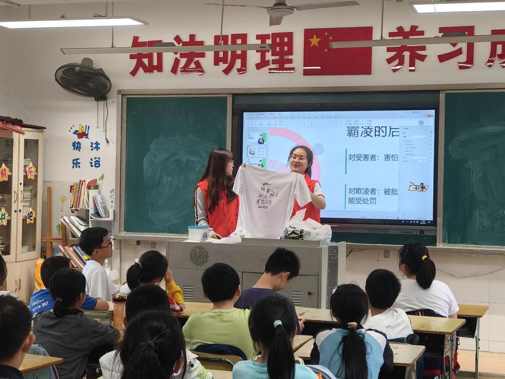 “《民法典》第一千一百八十八条规定,无民事行为能力人造成他人损害的,由监护人承担侵权责任;《未成年人保护法》第三十九条明确禁止学生欺凌行为……”普法团成员以真实案例为切入点,将晦涩的法律条文转化为生动的“法治故事”。通过展示三块印有法律条文的自制“盾牌”,带领学生齐声诵读,并借助“白衬衫隐喻实验”,引导孩子用黑笔标注霸凌行为、红笔勾画心理伤痕,直观呈现校园霸凌的隐性伤害。“法律不仅是惩罚,更是修复与保护的力量。”志愿者结合《治安管理处罚法》《预防未成年人犯罪法》等,系统阐释了霸凌行为的法律边界与维权路径,让“纸面上的法”化作守护童心的“盾牌”,以专业赋能,让法律条文转化为“听得懂的生命课”。
