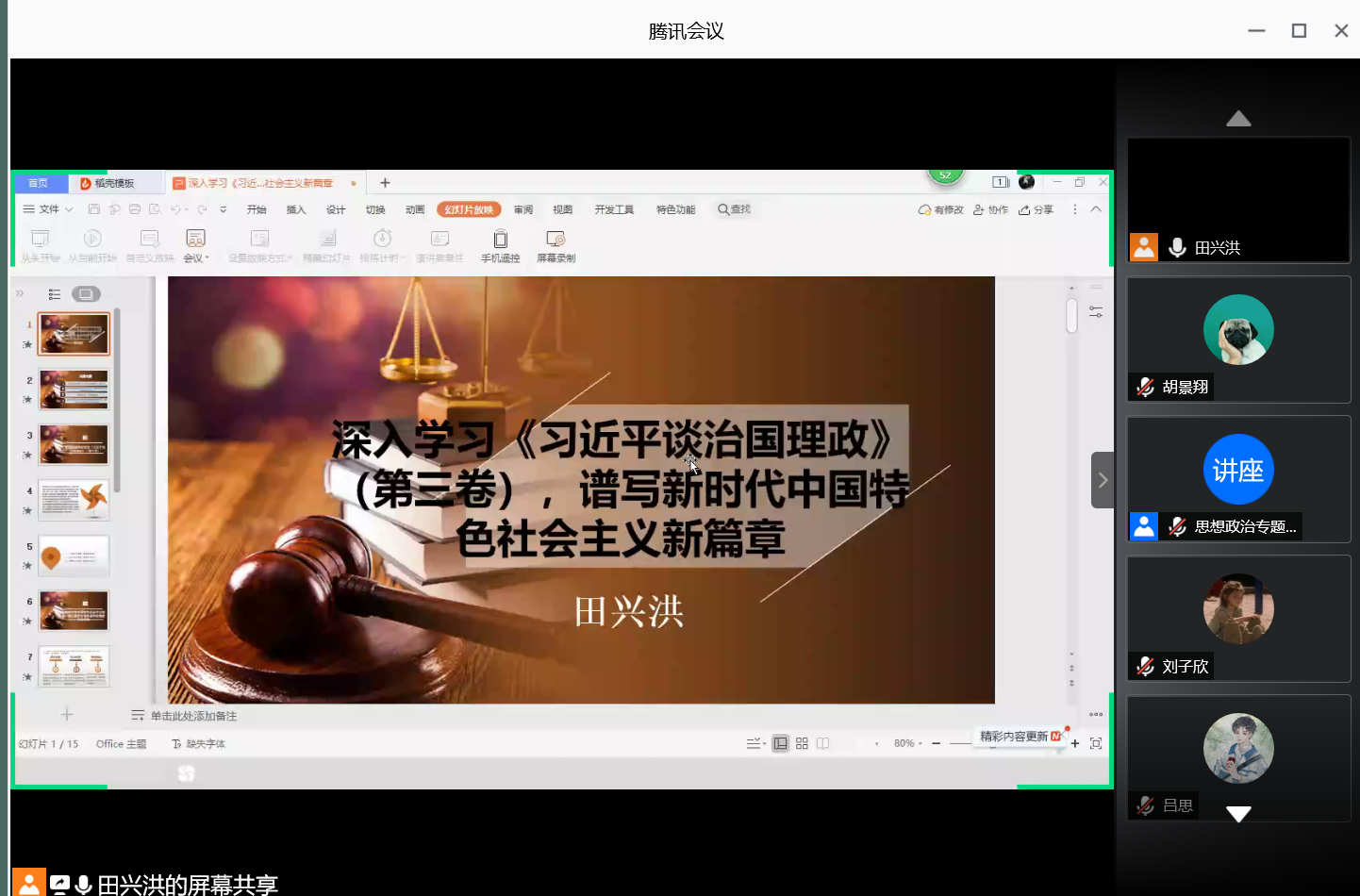 9月17日晚20时,法学系在腾讯会议线上进行《习近平谈治国理政》第三卷专题党课学习,法学系全体教职工、全系学生党员、入党积极分子参加全体成员参加。专题党课由党总支书记田兴洪主讲。