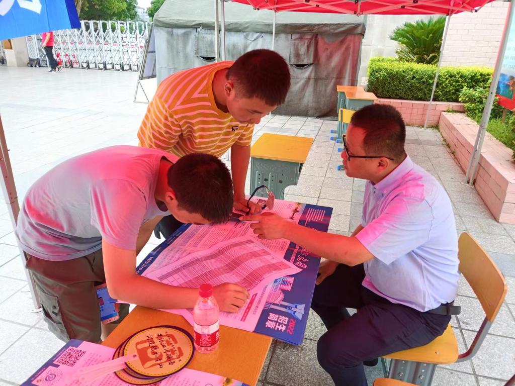 因疫情影响,招生宣传组在中学门口摆点开展宣讲,学校招生宣传宣传手册、创意钥匙扣及配有校徽的定制口罩等特色鲜明的宣传材料,吸引不少考生及家长前来咨询,学院招生宣传小组主动沟通,热情交流解惑,进行报考政策咨询解读,现场气氛火热。