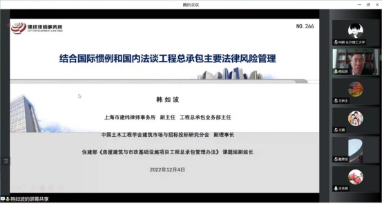 2022年12月4日,湖南省法学会工程法学研究会2022年年会暨工程法前沿问题学术研讨会在线上腾讯会议室隆重召开,本次年会由湖南省法学会工程法学研究会主办,中国建筑第五工程局有限公司承办,上海建纬(长沙)律师事务所、湖南金州律师事务所协办。来自湖南省高院、长沙市中院、长沙仲裁委、郴州市中院、中建五局、湖南建投集团、中国水电八局、五矿二十三冶建设集团、中铁五局、上海市建纬律师事务所、湖南金州律师事务所等司法实务部门以及省内高校等科研机构的百余名专家学者参加会议。