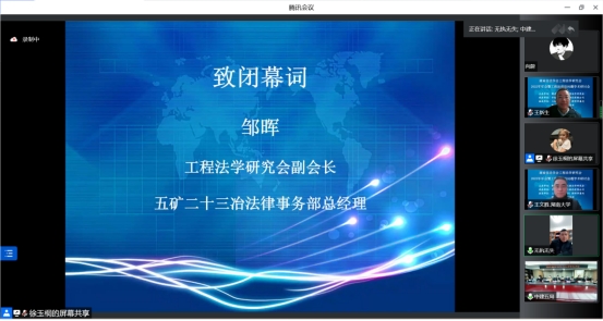 会议闭幕式由中建五局法律部副总经理李玲主持,湖南大学法学院副院长王文胜致总结辞,五矿二十三冶法律事务部总经理邹晖致闭幕辞,代表工程法学研究会对各单位的大力支持以及嘉宾同仁们的莅临表示感谢。