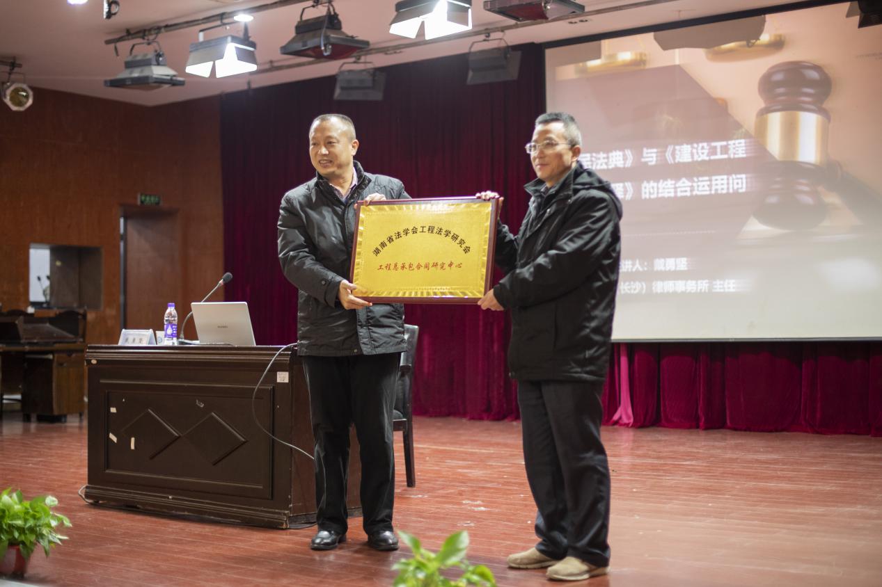 讲座伊始,张敏纯主任首先代表学校和法学系诚挚感谢了戴勇坚教授的到来,并介绍了戴勇坚教授的学术经历和工作经验。随后,在张敏纯教授的主持下,举行了隆重的挂牌仪式,由戴勇坚教授和王新生教授共同挂牌并正式宣布湖南省法学会工程法研究会工程总承包合同研究中心在伟德成立。