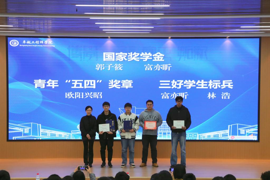 机电教改2101班张博荣做基层样板党支部工作分享,从支部建设、示范作用及学风调研三个方面展开,介绍支部“三会一课”、党日活动开展情况及支部成员风采,展示学院学生党员先进性。电气创新2201班马凤婕做团学工作主题分享,从院团委学生会实际情况出发,分思想引领、学风养成、学科竞赛、社会实践、文体活动等多方面展现学生会过去一年的工作绩效并对下一年工作进行展望。土木教改2101团支部曾子宁做“五四”红旗团支部工作分享,从支部建设、学风引领等方面展开介绍,重点介绍支部特色工作,为全体学生展现了一个积极进取、互帮互助的优秀集体。青年“五四”奖章获得者欧阳兴昭分享自身在科研创新上的经验分享以及竞赛经历,介绍竞赛信息的获取途径和竞赛心得与体会,提醒同学们要找到适合自己的竞赛领域,合理规划时间,减少盲目地学习,将自己的收获最大化。国家奖学金获得者郭子筱从课程学习经验、比赛经验、科研经验等多方面进行分享,指出在课程学习中要及时总结、合理规划,并善用各类学习工具使自己的学习更高效。活动现场,对获评国家奖学金、青年“五四”奖章、三好学生标兵等个人荣誉称号的同学进行表彰。