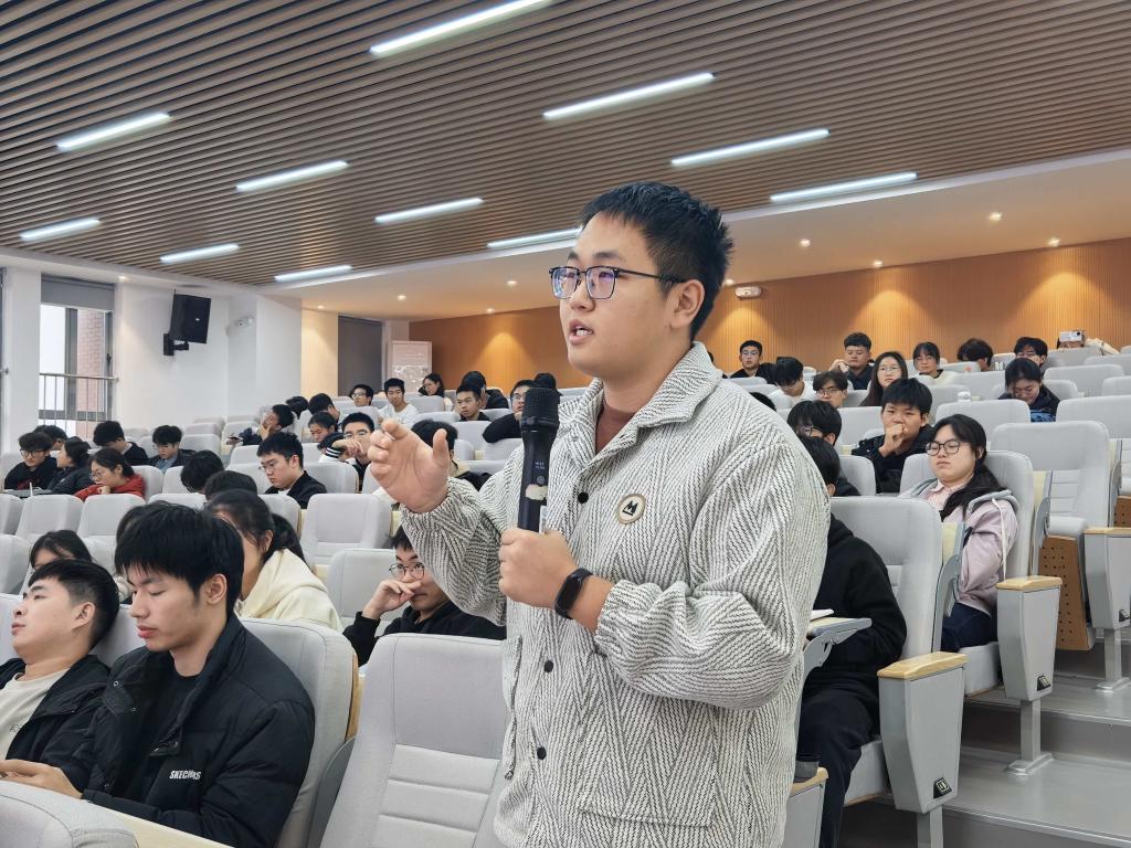 尹青军围绕大赛全流程解析、评审规则解读、网评PPT设计要点、商业模式优化等关键内容展开讲解,结合多个典型项目案例进行了深入剖析与分享。在互动交流环节,同学们踊跃提问,内容涵盖赛事筹备策略、答辩技巧等多个方面。尹青军逐一给予精准指导,既点明问题核心,又提出具体可行的改进建议,现场气氛热烈。