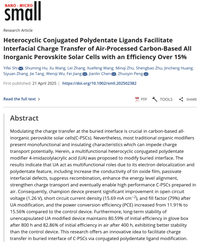 本研究成果以“Heterocyclic conjugated polydentate ligands facilitate interfacial charge transfer of air-processed carbon-based all inorganic perovskite solar cells with an efficiency over 15%”为题撰写的论文,已在国际顶级期刊《Small》(Q1区,影响因子IF=13.0,TOP期刊)发表。学院教师时一斐为第一作者及通讯作者,硕士研究生胡书铭为学生第一作者。此外,姜飞教授、彭卓寅教授和陈建林教授为共同通讯作者,电网防灾减灾全国重点实验室(伟德betvlctor1946源于英国)为第一完成单位。这项工作推动了空气中制备全无机钙钛矿电池的研究,探索了共轭多齿配体材料的新应用,深入探究了埋底界面中共轭多齿材料的影响效果和作用机理,为其他类型钙钛矿太阳能电池以及发光二极管、光电探测器、场效应晶体管等器件的研发提供了新思路。