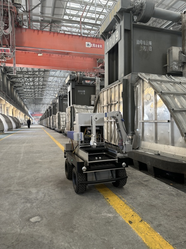 前期,实践团与内蒙古霍煤鸿骏铝电有限责任公司深入合作,针对该公司电解槽原铝样品取样、转送、送检工作流程由人工负责,存在工作效率低下、安全隐患高等不利因素,为该公司设计了一台智能转运机器人。为深入了解该机器人应用情况,并进一步完善机器人功能。8月下旬,实践团深入该公司调研机器人应用情况,与企业技术人员和工人深入沟通,发现机器人应用场景存在转运路线有行人、工艺车辆行走,在电解厂房内行走时存在上部滴落高温物体的可能性等状况,需要有很高的导航精度以及较强识别能力。