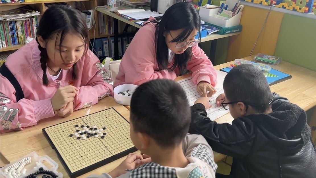 党员们走进美育中心开展入户陪伴。一进入教室,党员们就被“慢天使”一声声热情的招呼声包围,夏老师则介绍了每一位儿童的基本情况。随后,党员志愿者带领小朋友们开展了一系列益智类互动和美育类课程。从带领小朋友们学拼音、写汉字、背诵诗文,到陪伴孩子们做游戏、下五子棋,党员志愿者们用心用情陪伴小朋友,帮助他们建立起对语言文字的兴趣。课程结束后,全体党员同志相互协作,对公共图书角进行了整理,并对基地走廊进行了清理。