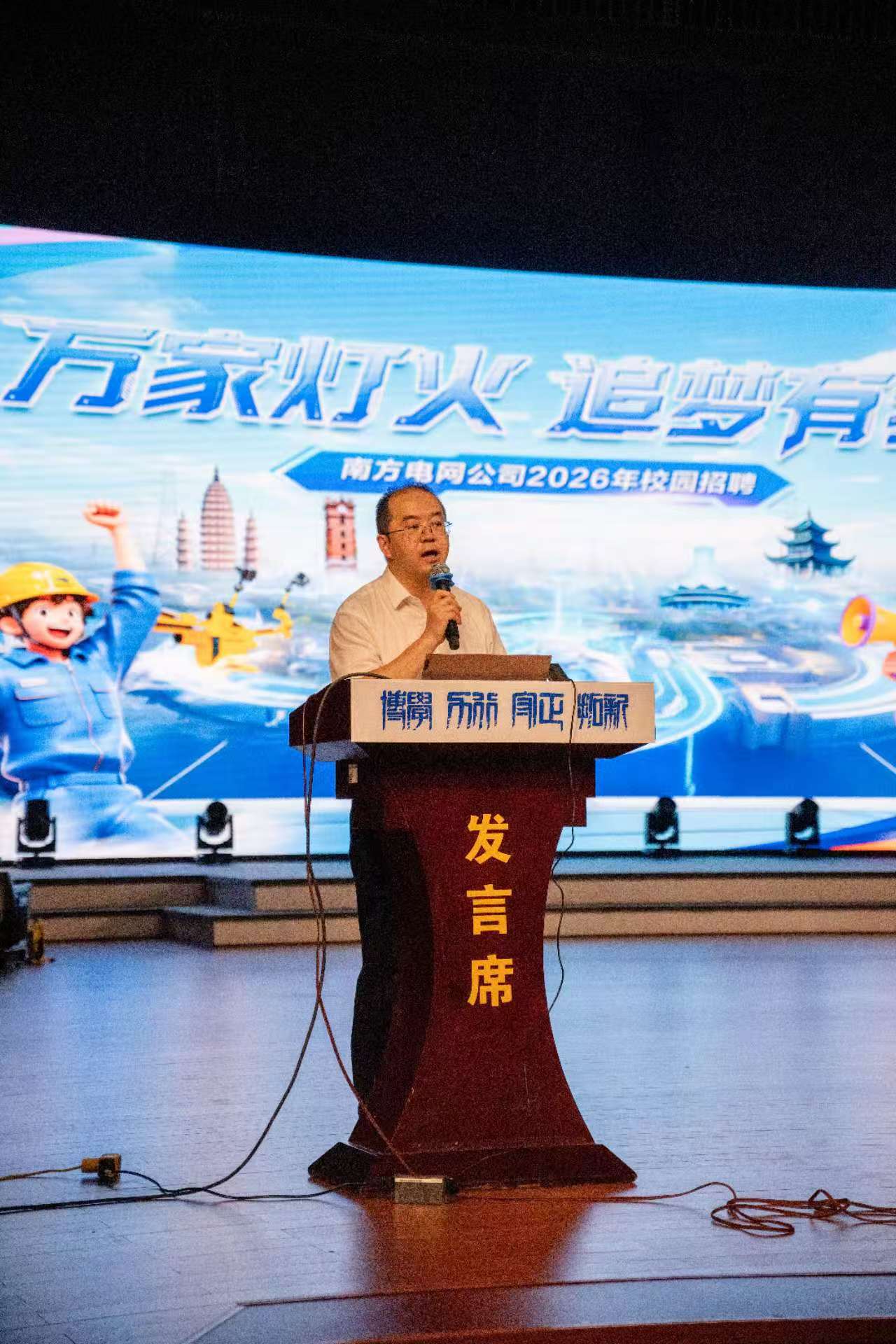 9月24日,中国南方电网有限责任公司2026届毕业生招聘宣讲会在伟德云塘校区大会堂举行。云南电网有限责任公司人力资源部副主任谢汉竹一行来校宣讲,学校就业创业处处长田上,电气学院党委书记丁丹、党委副书记周巍等领导出席,千余名学子及部分家长踊跃参与,现场座无虚席,气氛热烈。