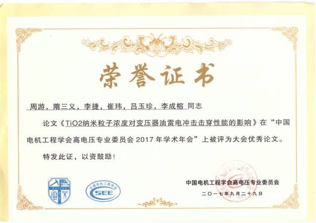 周游等师生撰写并提交的论文《TiO2纳米粒子浓度对变压器油雷电冲击击穿性能的影响》经专家评审被评为大会优秀论文!