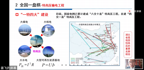 课堂上,张静老师通过介绍我国当前战“疫”的大好形势,引出电力领域在抗疫道路上作出的巨大贡献。“战疫保电,国网在行动。”国网从全局考量,分别从电力供应、物资供应、人员调配三个方面举全国网之力驰援武汉,重点介绍了火神山、雷神山等新建医院的电力可靠保障。她强调了湖北电网的战略地位并提出本次课程的“主角”—特高压输电工程,它是实现“国网一盘棋”的能源输送大工程,其关键装备与技术是“造血通脉”的国之重器。