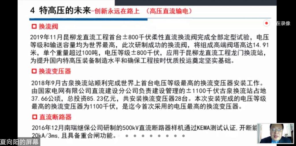 裴翔羽老师进一步对特高压直流输电领域的“国之重器”进行图片展示和技术介绍。在换流阀、直流断路器、柔性直流输电控制保护设备、直流电网快速行波保护装置以及直流电网实时数字仿真平台等关键装备和技术方面,我国已处于世界领先水平,真正实现了“中国引领”和“中国创造”。