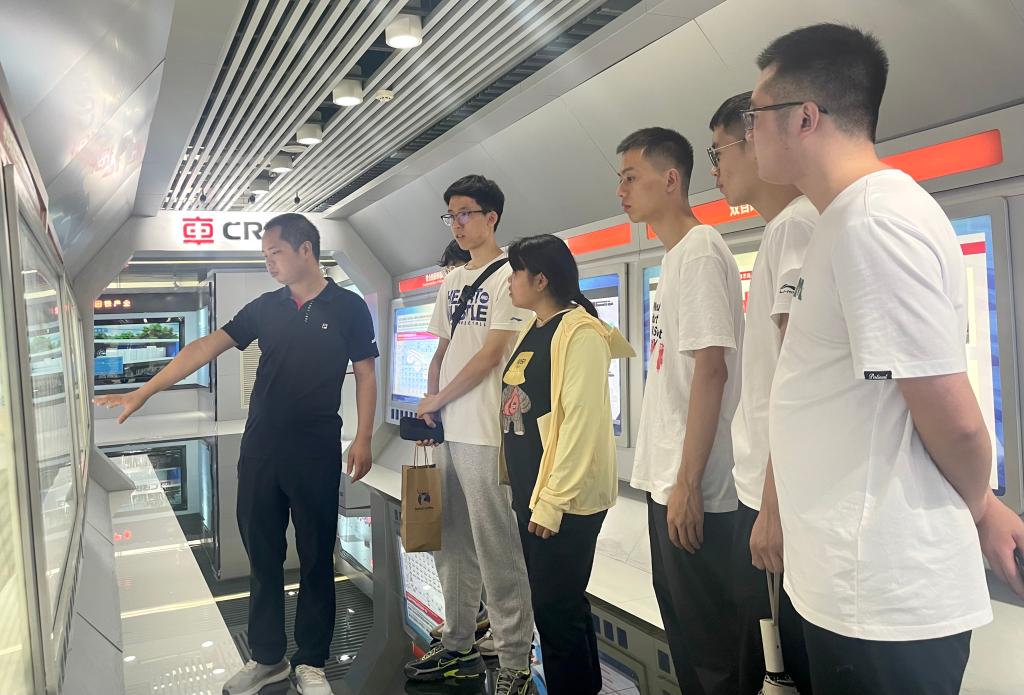 在中车株洲电力机车有限公司,实践队员在项目经理陆雄建工程师的带领下深入参观研究所的成果展示中心,现场了解企业的最新技术成果、科技产品,切实感受中车株洲电力机车研究所以轨道交通板块为核心,涵盖新材料、新能源、电力电子器件及智轨等多个板块的多元化发展状况,及其对中国智能智造、绿色制造的赋能之路。