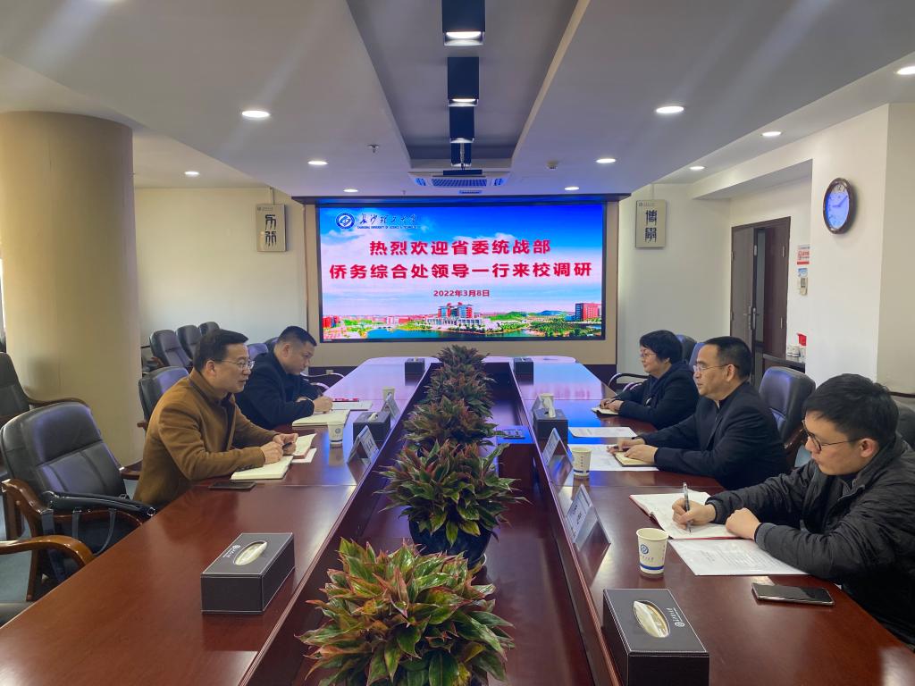 黄自力对省委统战部侨务综合处雷五星一行表示热烈欢迎,并围绕学校与海外的合作交流、侨联情况、外教和留学生情况以及存在的问题等介绍了学校统战相关工作。他表示,学校以发挥新时代统一战线法宝作用为目标,坚持守正创新,注重统筹谋划,统战工作的质量和水平不断提高。希望省委统战部侨务综合处进一步指导和支持学校统战工作,开创学校海外统战工作的新局面。