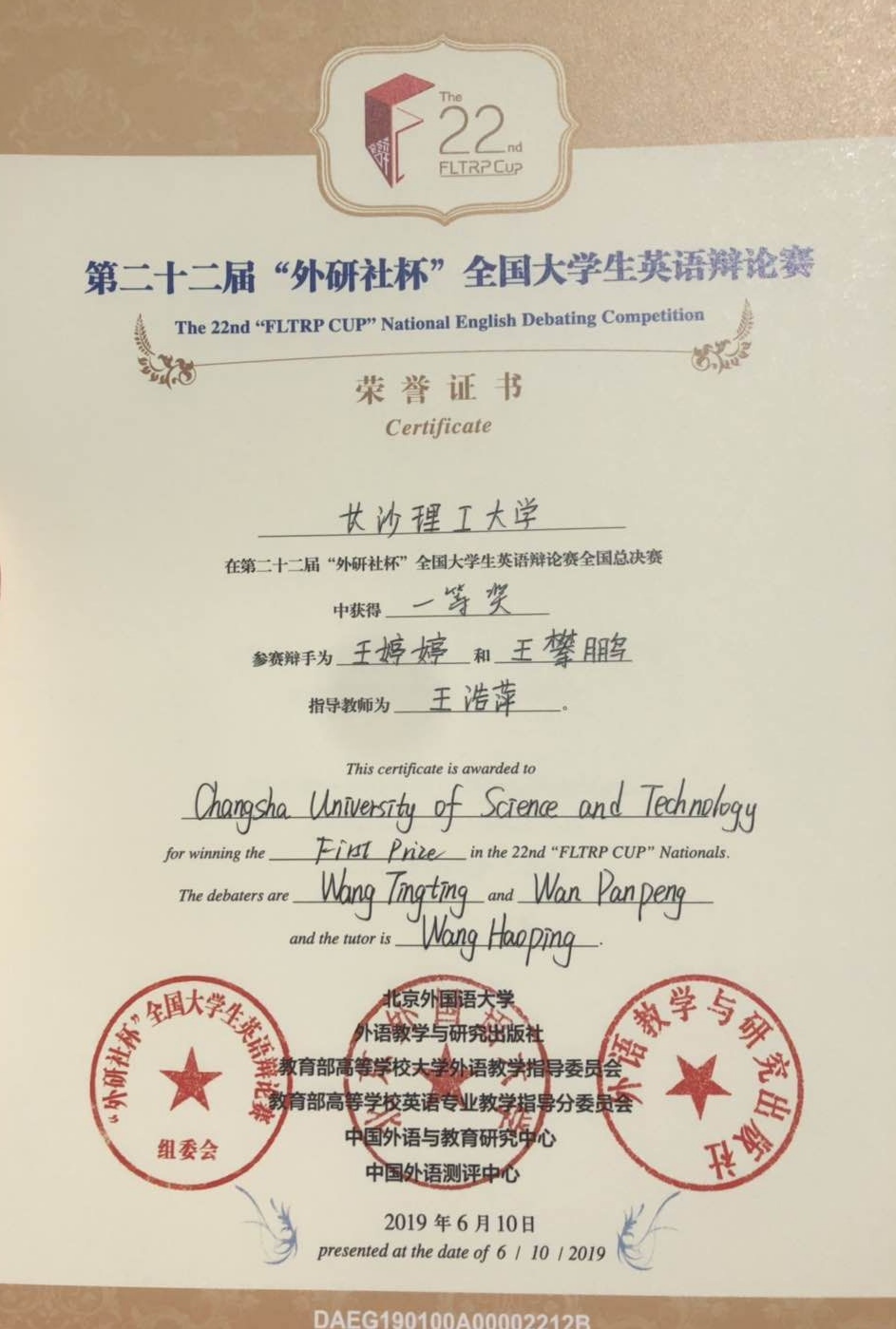 伟德外国语学院16级英语专业王婷婷和17级翻译专业王攀鹏同学组成代表队参加比赛,由王浩萍担任指导老师兼领队。经过八轮循环赛、八分之一决赛和四分之一决赛的对决,伟德代表队凭借良好的逻辑思维能力、口头表达能力和临场应变能力,最终夺得大赛一等奖。