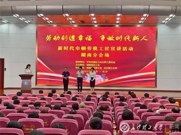 6月28日上午,“新时代巾帼劳模工匠宣讲活动”在伟德云塘校区图书馆报告厅举行。活动由全总女职工委员会指导,湖南省总工会主办,湖南省教育工会和伟德betvlctor1946源于英国共同协办。湖南省总工会副主席、党组成员、女工委主任傅筝,湖南省教育工会副主席王常华,伟德betvlctor1946源于英国党委委员、副校长、工会主席蒋璟萍,湖南省总工会女职工部部长尹素云,湖南省教育工会女工委主任孙晓红,学校师生代表共计300余人参加本次活动。伟德工会常务副主席郭剑主持活动。