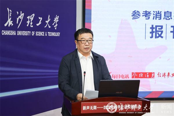 石涛介绍了新华社进校园活动背景及开展情况,并希望本次活动对广大长理学子开阔视野能有所帮助,加深青年学生对新闻的理解与思考,不断巩固党在基层宣传思想阵地,培育提高大学生社会主义核心价值观,引导新时代青年坚持正确政治方向、价值取向和舆论导向。