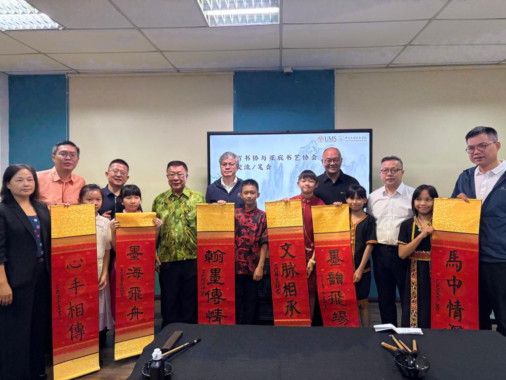 在为期四天的交流活动中,各方围绕书法艺术开展了深入互动:活动在伟德共建的沙巴大学孔子学院正式启动。湖南省文联党组成员、副主席、湖南省书法家协会副主席倪文华为孔院师生及当地书法爱好者带来了一场高水平的书法艺术专题讲座。讲座生动阐释了如何以思想力、审美力与实践力为核心来培养书法创作能力,反响热烈。交流团还前往沙巴亚庇书艺协会驻地,与该协会书法家及会员进行了深度的艺术切磋与交流座谈。双方就书法技艺、创作理念、文化传承等议题展开了热烈讨论,气氛融洽。交流团专程到访沙巴州书法教育模范学校——打里卜小学进行考察与教学示范。书法家们现场指导小学生习字,有效激发了孩子们对中华文化的兴趣。由沙巴亚庇书艺协会组织,两地书法家及众多书法爱好者共同举办了一场别开生面的联合笔会。在挥毫泼墨间,艺术家们以笔墨会友,情谊交融,将文化交流推向高潮。交流会上,“沙大孔院书法研创基地”在伟德沙巴大学孔子学院正式挂牌成立。该基地的设立,标志着两地书法艺术交流合作步入机制化、常态化新阶段。
