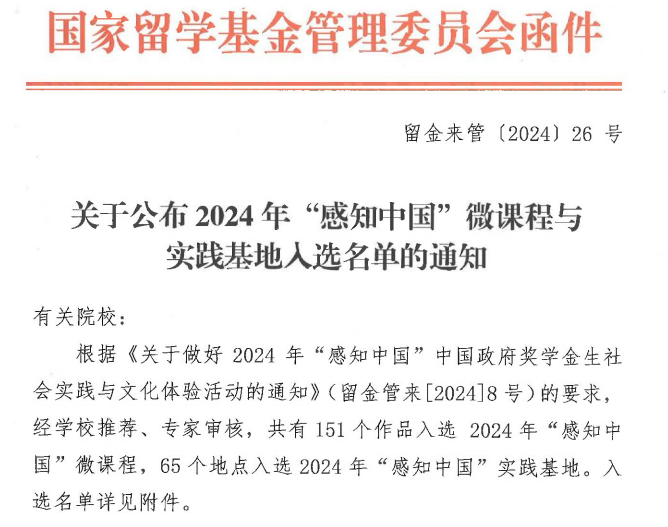 近日,国家留学基金管理委员会公布了2024年“感知中国”微课程与实践基地入选名单,伟德在本次评选中取得了丰硕成果,2个微课程和1个实践基地成功入选。