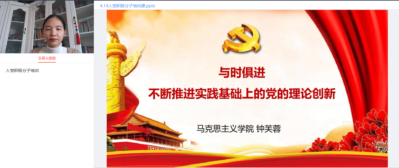 随后,马克思主义学院钟芙蓉老师通过超星学习通直播的方式,为入党积极分子进行了授课,授课主题为《与时俱进---不断推进实践基础上的党的理论创新》。钟老师从党的理论创新的基本线索、党的理论创新的实践本质、党的理论创新的基本经验三个方面,向学员进行详细讲述。课程内容丰富、授课方式生动活泼,深受学员喜爱。课后,接受培训的学员纷纷表示收获很大,意犹未尽,加深了他们对党的理论的认识和理解。