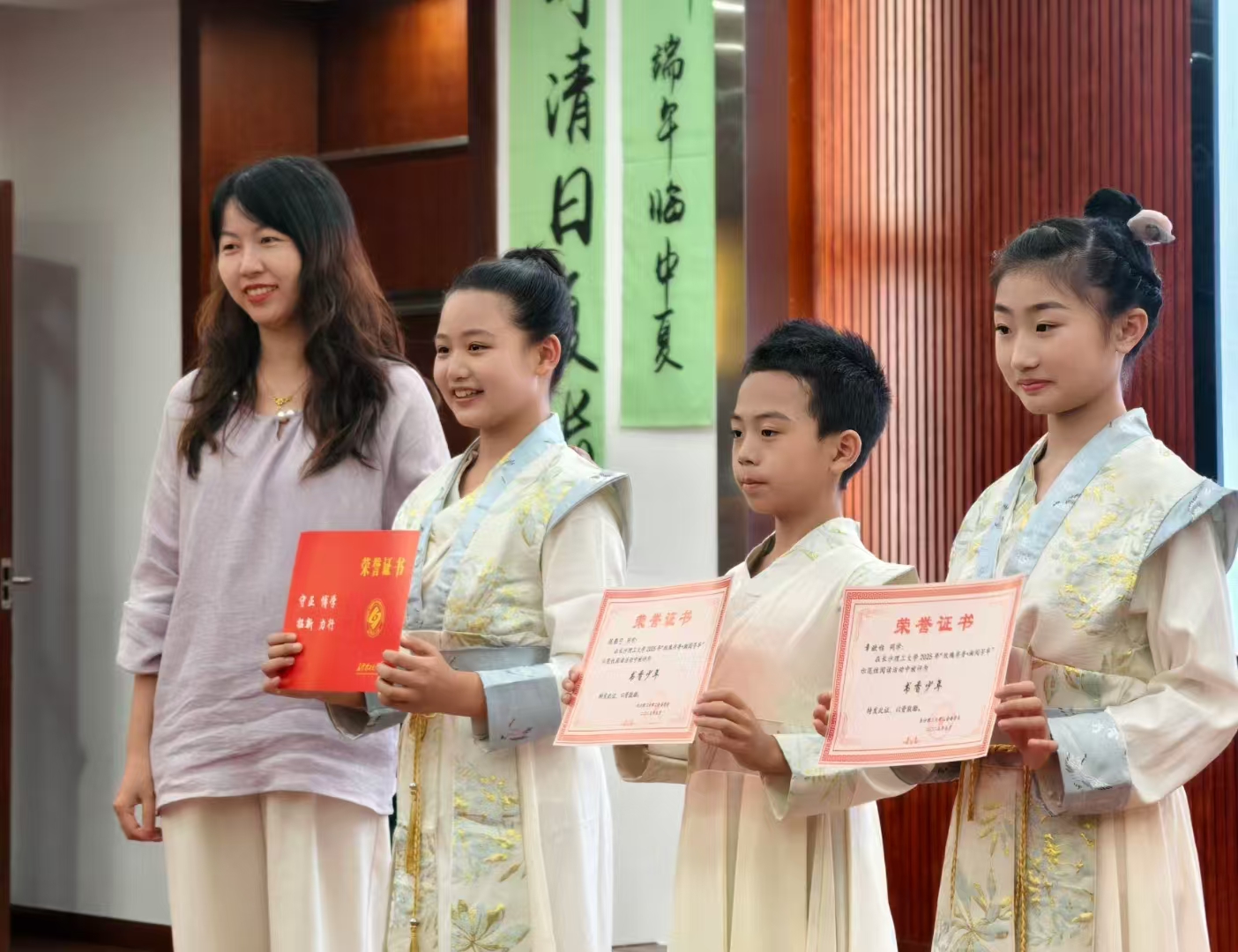据悉,活动由校工会主办,教职工朗诵协会承办,各级各单位代表80余人参与。活动设置“经典诵读”“好书分享”“主题讨论”“好书互换”“大合诵”“端午香囊制作体验”等六大环节,颁发了“书香领读者”“书香荐读者”“书香朗读者”“书香少年”等四大奖项。