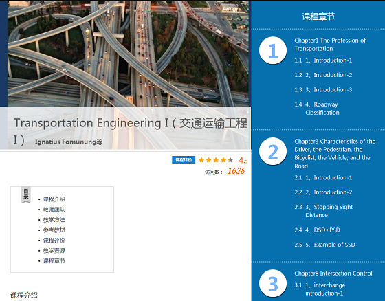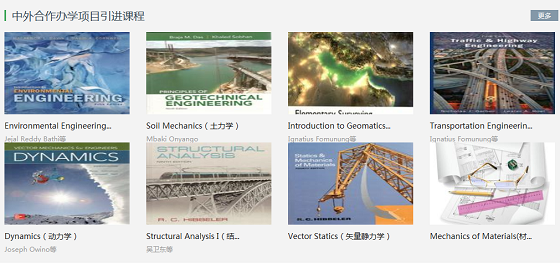 该批引进课程在线开放课程包括Introduction to Geomatics(测绘测量学)、Soil Mechanics(土力学)、Transportation Engineering I(交通运输工程I)、Structural Analysis I(结构分析I)、Dynamics(动力学)、Vector Statics(矢量静力学)、Mechanics of Materials(材料力学)以及Environmental Engineering(土木工程环境)。课程涵盖完整的课程视频资料、课程介绍、课程章节、教师团队、教学方法、课程评价、教学资源、习题作业和参考教材。授课视频采用随堂录制方式,分章节对课程全部知识点、重点与难点进行了详尽的讲解,并介绍了前沿学科动态和发展方向。该批引进课程自上线开放以来,点击观看量迅速增长,获得了师生们的一致好评,不仅辅助了引进课程教学实施,为国际、交通、土木与水利学院等学校土木工程大类学生全天候实时在线学习提供了便利,而且有效促进了全校教师更好地吸收和共享引进课程内容、外教先进教学理念与独特教学方法等优质资源。