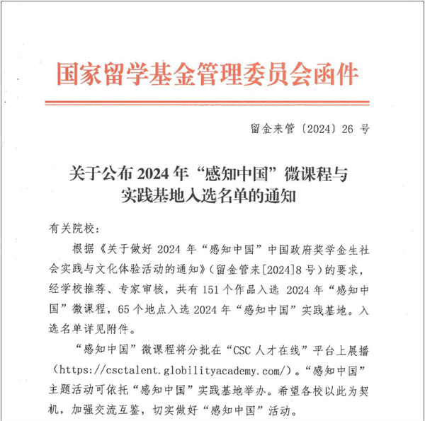 近日,国家留学基金管理委员会公布了2024年“感知中国”微课程与实践基地入选名单,伟德申报的两门微课程和一个实践基地成功入选。