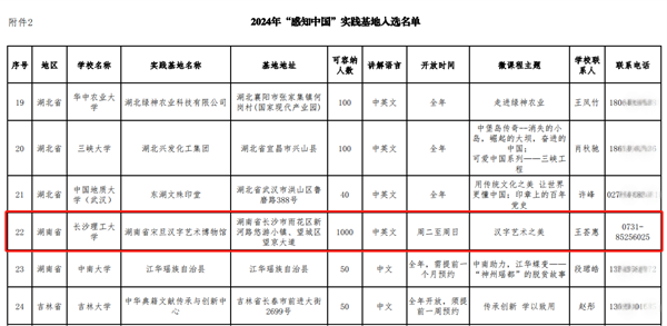 2024年“感知中国”微课程与实践基地评选是国家留学基金管理委员会“感知中国”活动实施十周年的系列活动之一,面向全国各类留学生招生院校申报。经学校推荐、专家审核等各环节,全国共有151个作品入选2024年“感知中国”微课程,65个基地入选2024年“感知中国”实践基地。伟德国际工学院张锐老师主讲的《橘子洲头咏长沙》和纪凯丽、张锐、冀文秀、李璐老师联合主讲的《云游星城》成功入选“感知中国”微课程。伟德联合湖南省宋旦汉字艺术博物馆申报的实践基地成功入选“感知中国”实践基地,作为全国首家汉字艺术主题博物馆,为国际学生提供了集汉字艺术研究创作、交流传播、陈列展示、体验互动、教育普及于一体的学习实践平台,帮助国际学生近距离感受汉字艺术之美,感知中华优秀传统文化。